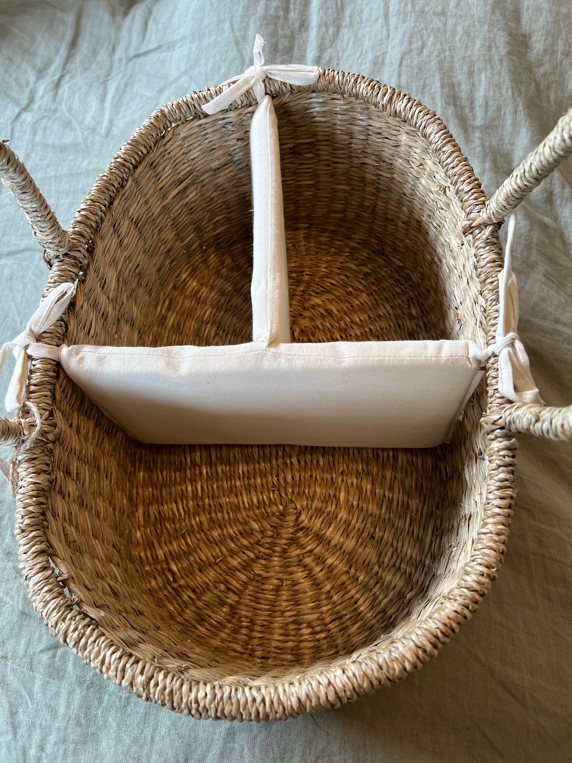 All beautifully displayed in a Bebe Bask Savannah caddy—A beautifully woven, portable caddy that keeps postpartum essentials within reach, whether by the bedside or couch.