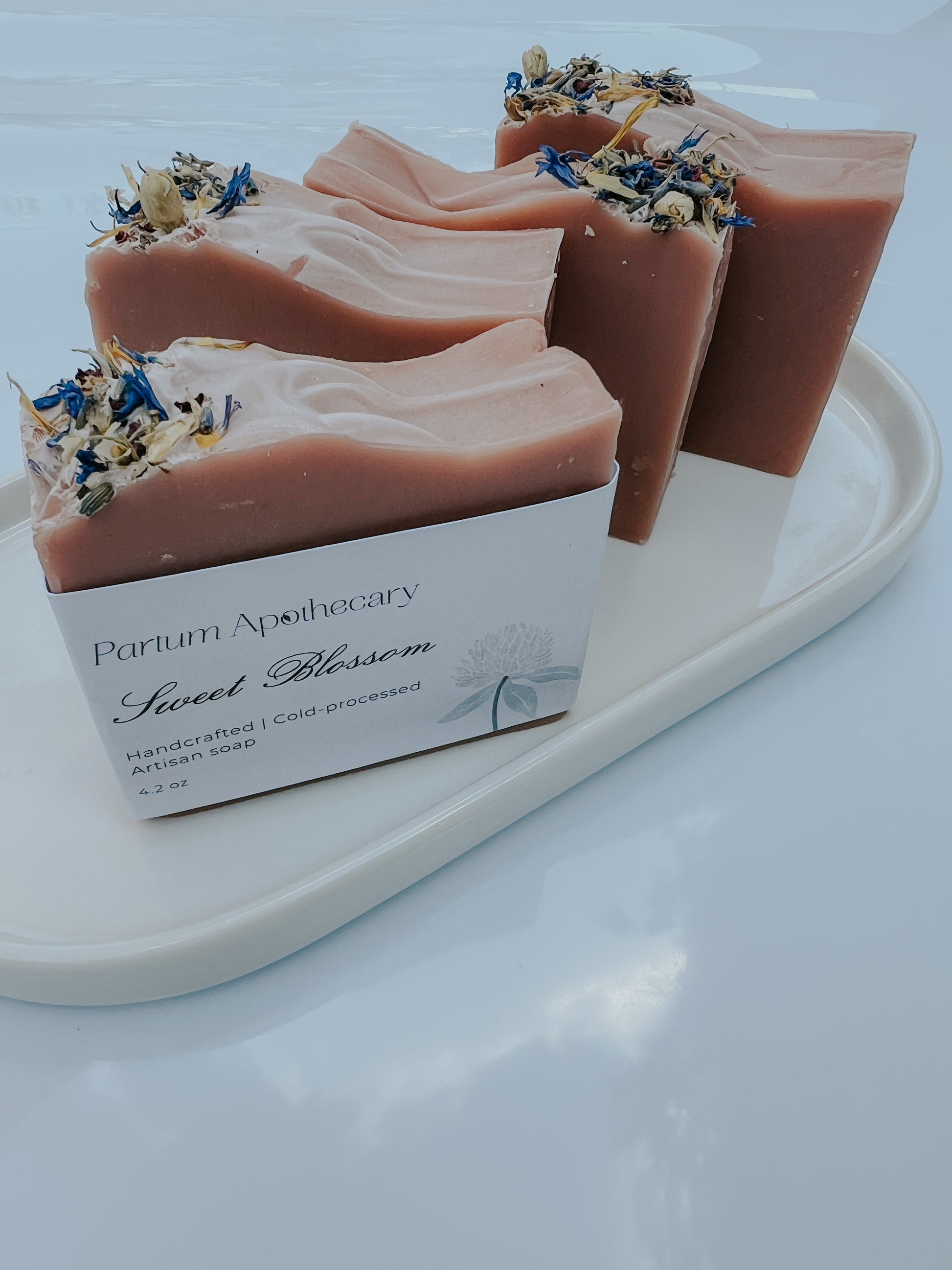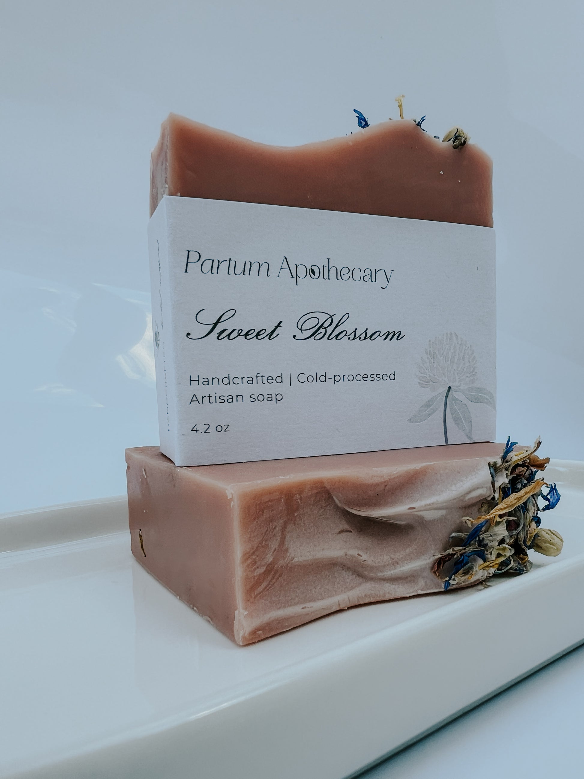 Wrap yourself in the gentle embrace of spring with Sweet Blossom, a handcrafted cold-process soap designed to nourish your skin and uplift your senses. Light pink in color and crowned with dried flower petals, this bar is a visual and aromatic delight.